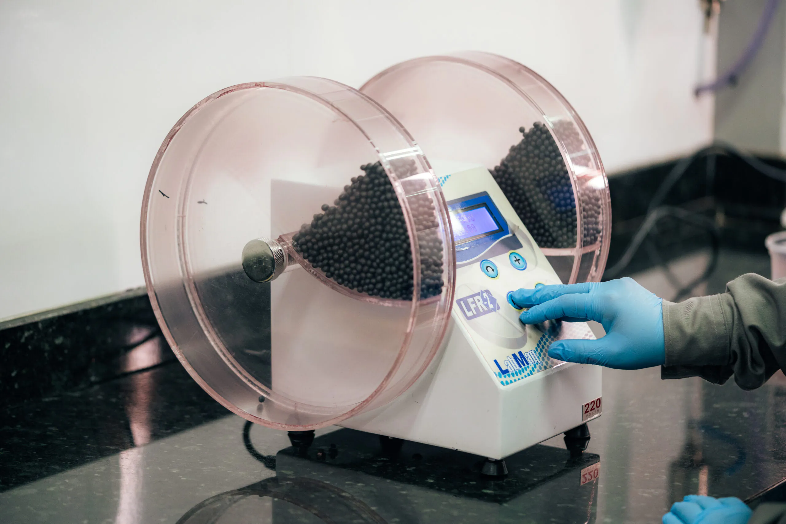 Trata-se de um teste de friabilidade. O teste visa avaliar a resistência física do recobrimento de tratamento de sementes ao atrito e os choques mecânicos que as sementes sofrem entre si simulando como elas se comportariam durante os processos de passagem em moegas após o tratamento e durante várias operações posteriores como ensaque, movimentação para armazenamento, transporte, circulação até as propriedades agrícolas e semeadura. Em certos casos ocorrem perdas significativas e visuais da cobertura tornando inaceitável o uso de certos produtos sem aditivos. Utilizamos um friabilômetro que simula situação de atrito por um período programado. Neste caso são realizadas avaliações quantitativas e visuais. Baseados nos resultados podemos determinar se há necessidade do uso de soluções alternativas que podem aumentar a aderência do tratamento de sementes utilizando por exemplo filmes de recobrimento específicos e binders. O cálculo da friabilidade é feito usando a fórmula: Friabilidade = (Peso Inicial – Peso Final / Peso Inicial) x 100%.